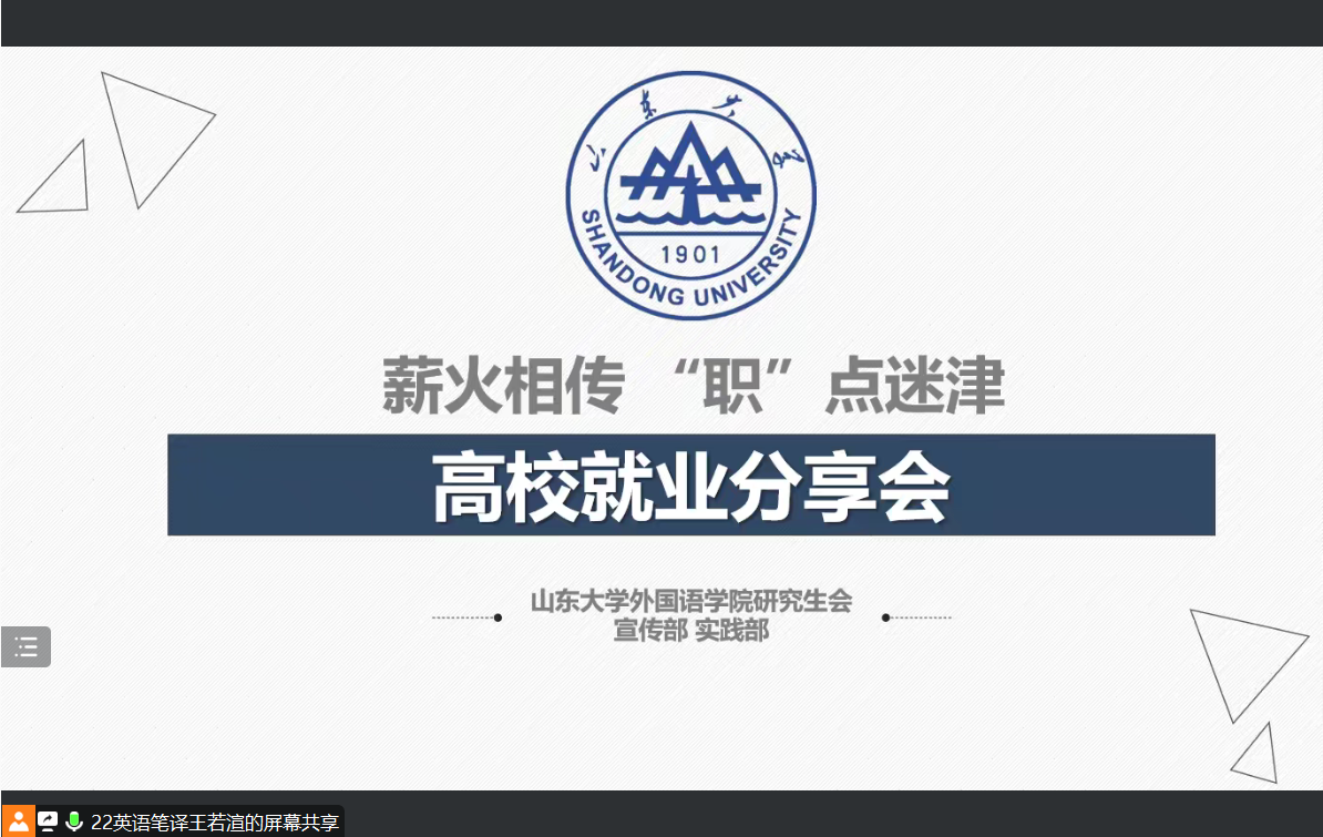 为帮助同学们了解多种就业途径,系统提升职业生涯规划意识,树立正确就业观,斩获优质岗位,5月11日晚,awc777万象城娱乐官网举办了线上高校就业分享会,共邀2022届英语语言文学专业颜鑫同、2022届英语口译专业匡琼琼、2022届德语语言文学专业刘春杉三位优秀校友进行分享。awc777万象城娱乐官网研究生辅导员张新苑、李雪倩出席本次活动,2022级英语笔译专业王若渲担任主持,全院的110余名学生参与了本次分享会。