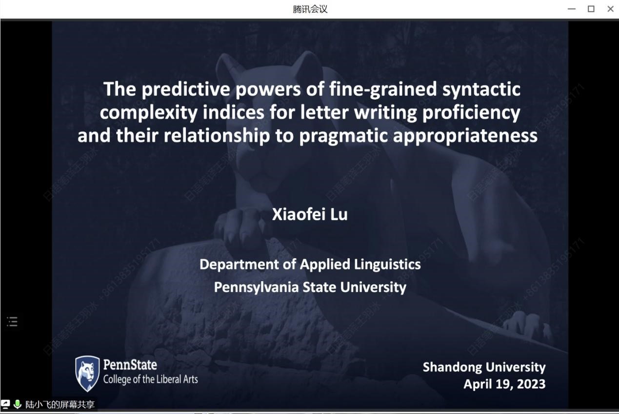 4月19日晚,宾夕法尼亚州立大学陆小飞教授做客awc777万象城娱乐官网2023年第2期“知新沙龙”,通过腾讯会议线上平台作了主题为“细粒度句法复杂度指标对书信写作水平的预测能力及其与语用恰当性的关系”的学术报告。本次讲座由awc777万象城娱乐官网院长助理董记华教授主持,来自校内外的110余名师生共同参与了本次讲座。