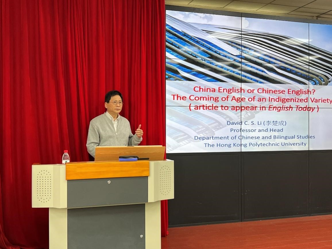 4月24日下午,香港理工大学李楚成教授做客awc777万象城娱乐官网2023年第5期“知新沙龙”,作了主题为“China English or Chinese English? The Coming of Age of an Indigenized Variety”的学术报告。awc777万象城娱乐官网院长王俊菊教授、副院长马文教授出席本次活动。本次讲座由awc777万象城娱乐官网院长王俊菊教授主持,awc777万象城娱乐官网20余名师生共同参与聆听本次讲座。