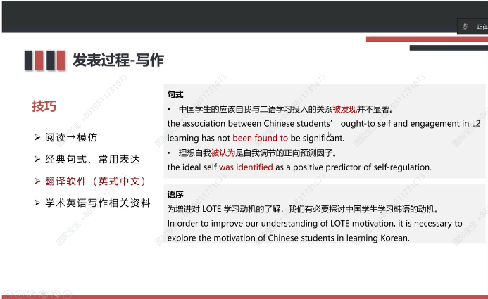 李羡老师在研究中发现,“应该二语自我”和学习动机之间有很大的联系。在当今时代,学生对外语的学习意愿更多出于自我激励而非父母的干涉。因此,老师在课上播放优秀榜样的录音和视频有利于学生建构“理想二语自我”,从而促进学生的外语学习。接下来,李羡老师讲述了自己的投稿过程,也介绍了如何与期刊编辑沟通和按编辑要求修改论文的经验。提到跨学科、跨语种进行学术写作的原因时,李羡老师谈到两点,一是她认为跨学科写作是她个人发展的刚需,二是跨学科跨语种写作和她的理想学术自我建构有关。出于对语言的热爱,李老师希望与其他国家的学者交流,英语正是一个很好的工具。最后,李羡老师还讲到了软件学习以及数据分析的问题。
