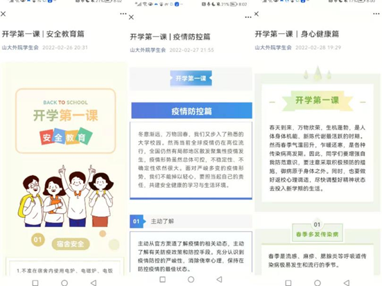 与此同时,各级学生组织也丰富活动载体,创新内容形式,积极依托微信公众号系列推文、线上主题团会等手段,增强活动吸引力、影响力。全院上下落实主体责任,形成工作合力,共同营造良好的教育氛围,让“开学第一课”真正入脑入心,助力广大同学迅速调整状态,以奋进姿态开启2022年春季学期新征程。