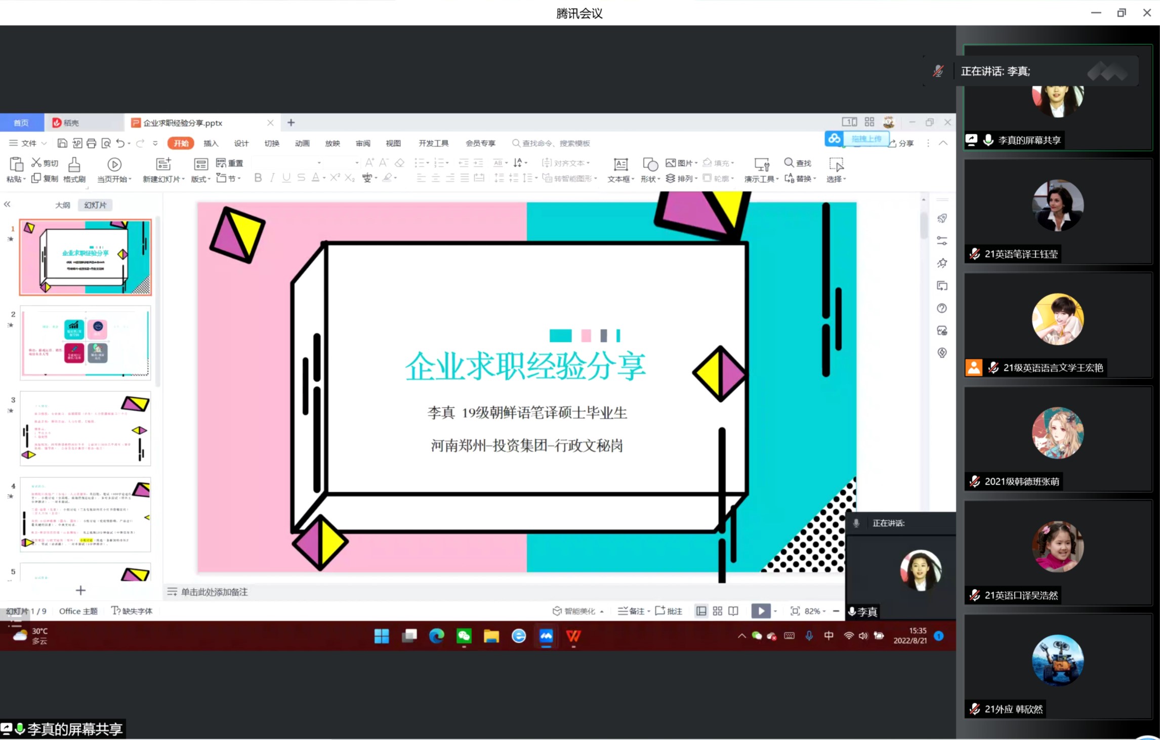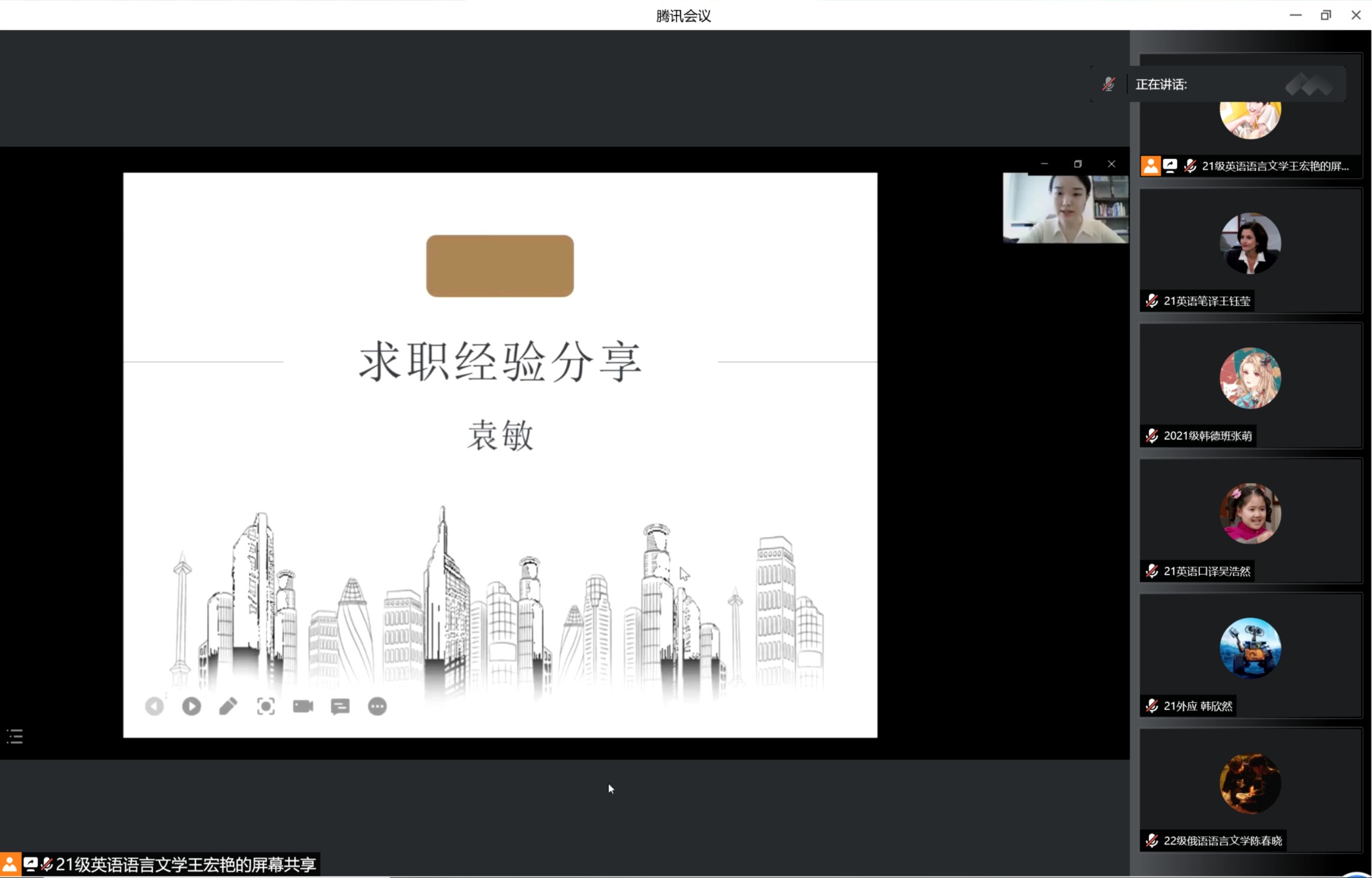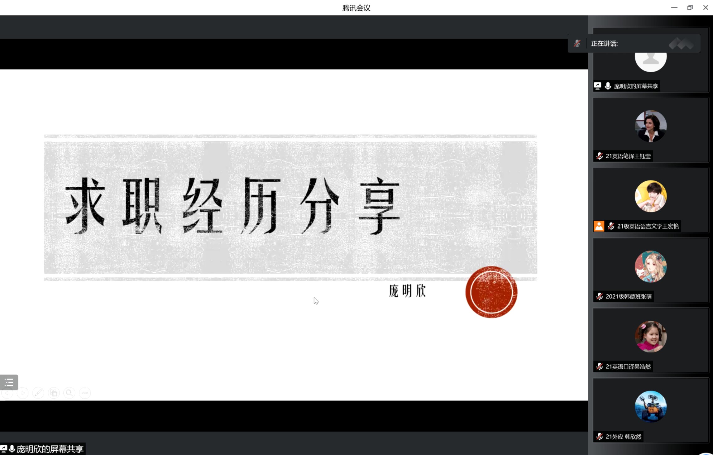 8月21日下午,awc777万象城娱乐官网通过腾讯会议举办了企业求职经验分享会。本次活动由awc777万象城娱乐官网研究生会实践部主办,邀请了五位已就业毕业生进行求职经验分享,共170余名研究生线上参与聆听。