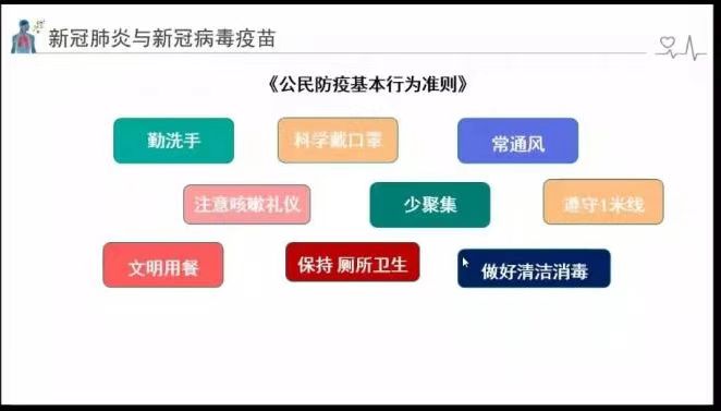 崔秋环老师从疫情常态化为切入点,从“新冠肺炎与新冠病毒疫苗”、“疫情常态化防控下的应急处置”、“校园常见传染病防控措施”、“近视方式与用眼卫生”、“意外伤害与应急救护”、“校园健康安全与就医指南”六个方面为同学们展开讲解。