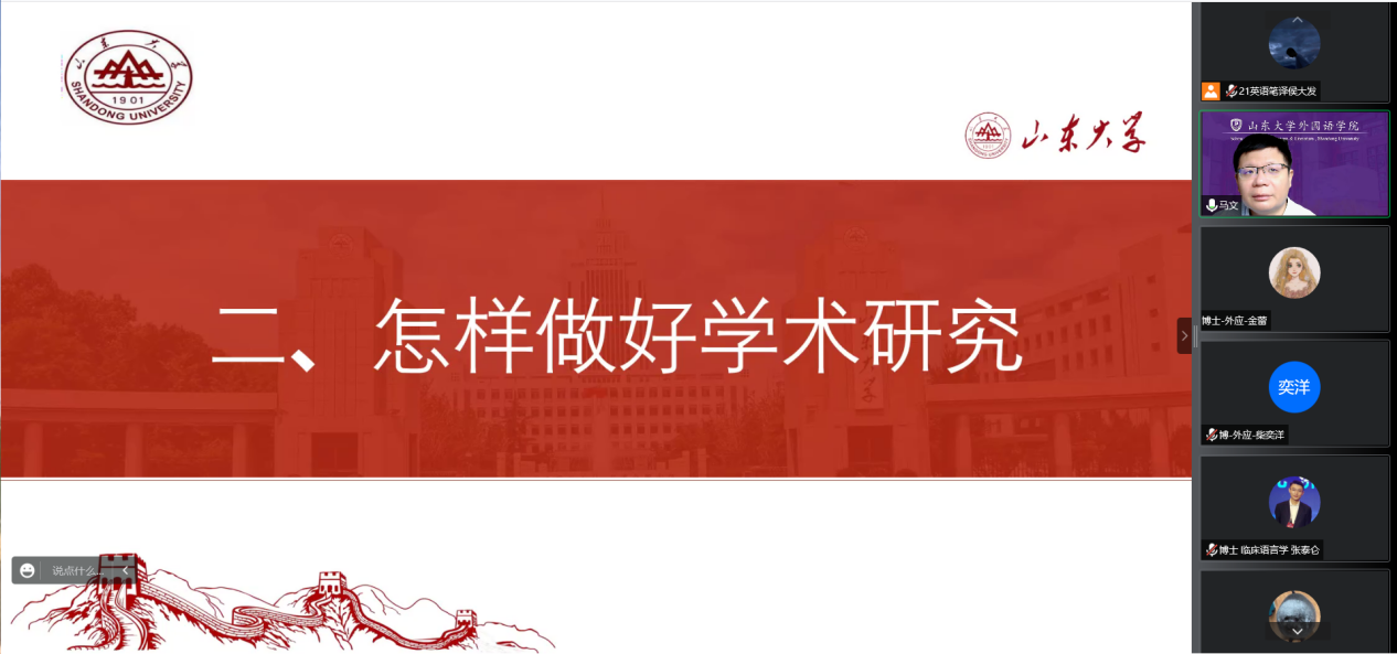 讲座伊始,马文首先向同学们介绍了学校、学院的发展历史、学科水平以及学术团队情况,并结合同学们的学习生活,与同学们探讨了外语人才培养体系,外语学科的研究平台,以及外语学科的未来发展。针对怎样做好学术研究问题,马文建议同学们要专心治学,认真对待专业课程学习,积极参加各种学术报告,具备交叉学科的意识,广泛参与学术实践活动,培养研究兴趣,提高研究水平,肩负社会责任与担当,遵循“四个面向”。马文提出,从本科到研究生阶段,同学们需要根据身份的转换树立自己的目标,努力成为高级研究型人才和高级应用型人才。谈及研究生怎样培养科研能力,马文指出,要善于思考、总结、提炼,善于和导师、同学交流,善于提高技能等,希望同学们在科研生涯中保持自信自强、持之以恒、戒骄戒躁。随后,马文以案例分享的方式向同学们介绍了学术不端与学术规范,以及涉及学术不端的处理办法、政策及规定,并从五个方面介绍了学术规范的基本要求,系统地对学术规范政策进行了解读;并介绍了我院的相关政策,重点阐述了学术论文的查重标准、引文规范、格式规范、论文署名等同学们经常遇到的学术规范问题,讲解了学术不端的责任问题以及后果处理,并表示:端正的学术态度决定一切,要具有严谨的治学精神。最后,马文希望同学们尽快进入学习状态,根据实际情况合理分配学习和生活时间,密切联系导师;鼓励学术学位的同学勤思考、多研究,专业学位的同学多参与专业实践活动;切实推进今后的学术研究,践行学术道德规范,并祝愿大家度过充实而富有成果的研究生学术生涯。