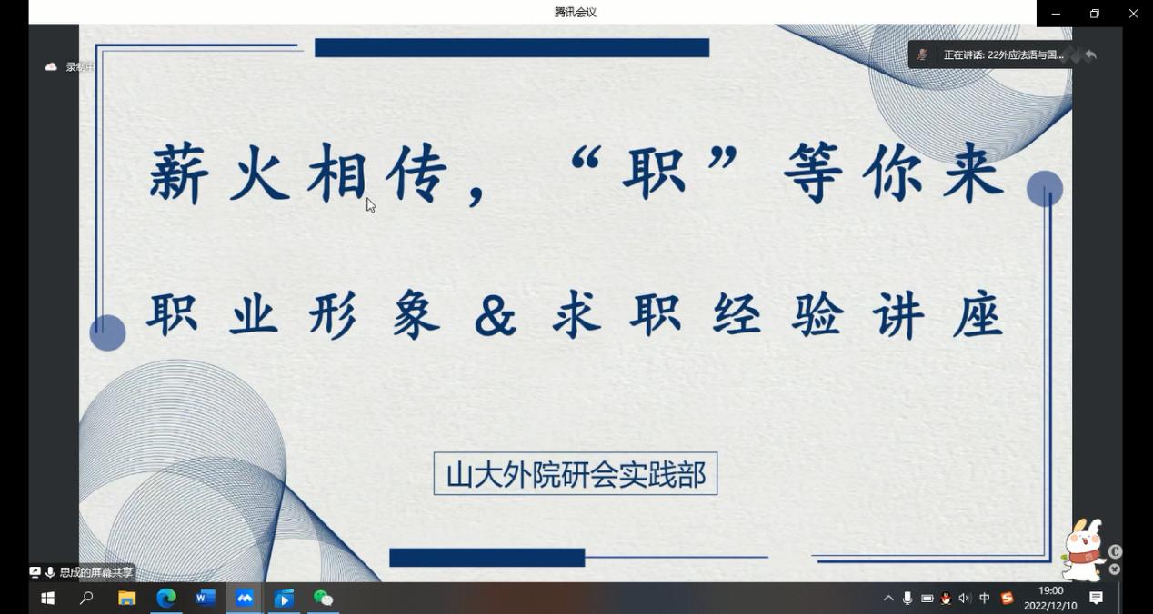 12月10日晚,awc777万象城娱乐官网通过腾讯线上会议,举办了职业形象&求职经验讲座。本次讲座由awc777万象城娱乐官网研究生会实践部与思成求职共同举办,思成求职CEO孔翔携手嘉宾宋辽,张乃心,进行了求职方法的指导与求职经验的分享。一百余名awc777万象城娱乐官网研究生参加了此次讲座。
