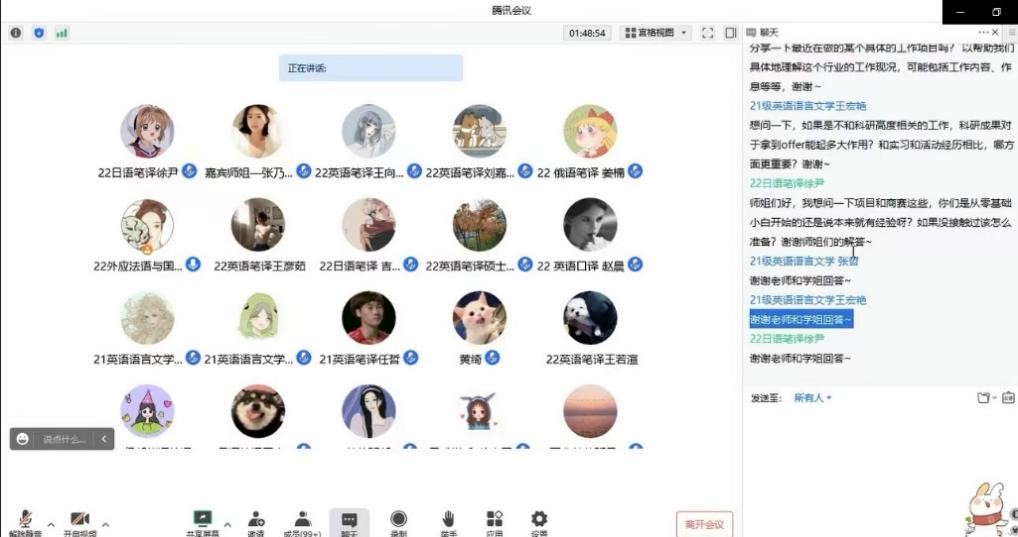 讲座伊始,孔翔分析了近几年严峻的就业形势,深度剖析外语类学生所面临的求职窘境并提出解决方案。他指出,外语类学生需要进行个人能力的升维,努力成为“五边形”战士。宋辽分享了斩获3个名企offer之前的心路历程与准备,回忆了所投递岗位的面试流程与面试方式,介绍了自己的面试技巧。最后,宋辽给即将步入求职阶段的同学们提供了诸多建议。她告诉同学们,求职过程中应放平心态,切忌眼高手低。根据宋辽的分享,孔翔进一步指出,可以从6个维度加强专业能力的提升,并规划了研究生阶段的准备步骤。张乃心首先介绍了自己从探索就业方向到拿到秋招offer的一系列过程,随后具体介绍了在求职过程中所做的准备,最后,回首一路走来的求职经验,她指出要树立清晰的目标,把握时间节奏,平衡学习工作,拒绝盲目努力。根据张乃心的分享,孔翔概括了名企的招聘流程,指出了网申过程中容易出现的问题,阐明了单面和群面时应具备的技能和掌握的方法。并且,就职业形象这一课题,他以简历照片为例,进行详细的指导。讲座尾声,孔翔、宋辽、张乃心分别对本次讲座进行总结。最后,同学们就项目内容、科研成果对offer的影响、项目准备等内容进行提问,并获得相应解答。