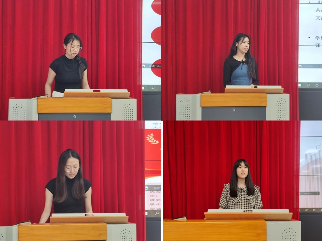 会议伊始,4位入党积极分子及新党员分享了关于理解当代中国的相关著作的读书报告与心得。2022级英语语言文学的李欣同志、2022级日语语言文学的刘芳含同志、2021级德语语言文学的郝雨桐同志及2021级英语口译的吴浩然同志分别分享了关于《乡土中国》《近代中国社会的新陈代谢》《共产党宣言》及《习近平著作选读》的阅读心得。李欣同志从著作主要内容出发,分析了城乡群体的异同点,结合“文化下乡”一章阐明外语人肩负的责任与使命。刘芳含同志按照时间顺序为我们梳理了中国近代史,并从政治、经济、文化等角度多方面分析了近代中国积贫积弱的原因,号召同学们用好历史教科书,迎接未来新挑战。郝雨桐同志为我们讲述了成仿吾校长翻译《共产党宣言》的经历,而《共产党宣言》在中国的百年编译传播是马克思主义中国化的一个缩影,引导同学们秉持精益求精的态度,更好地利用专业为社会主义事业做贡献。吴浩然同志为我们梳理了习近平总书记在《把宣传思想工作做得更好》的讲话中提出的“四个讲清楚”的要求,从外语人坚定文化自信、开拓国际视野等角度号召同学们真正做到学有所用、学有所成,为国家发展和民族振兴作出贡献。