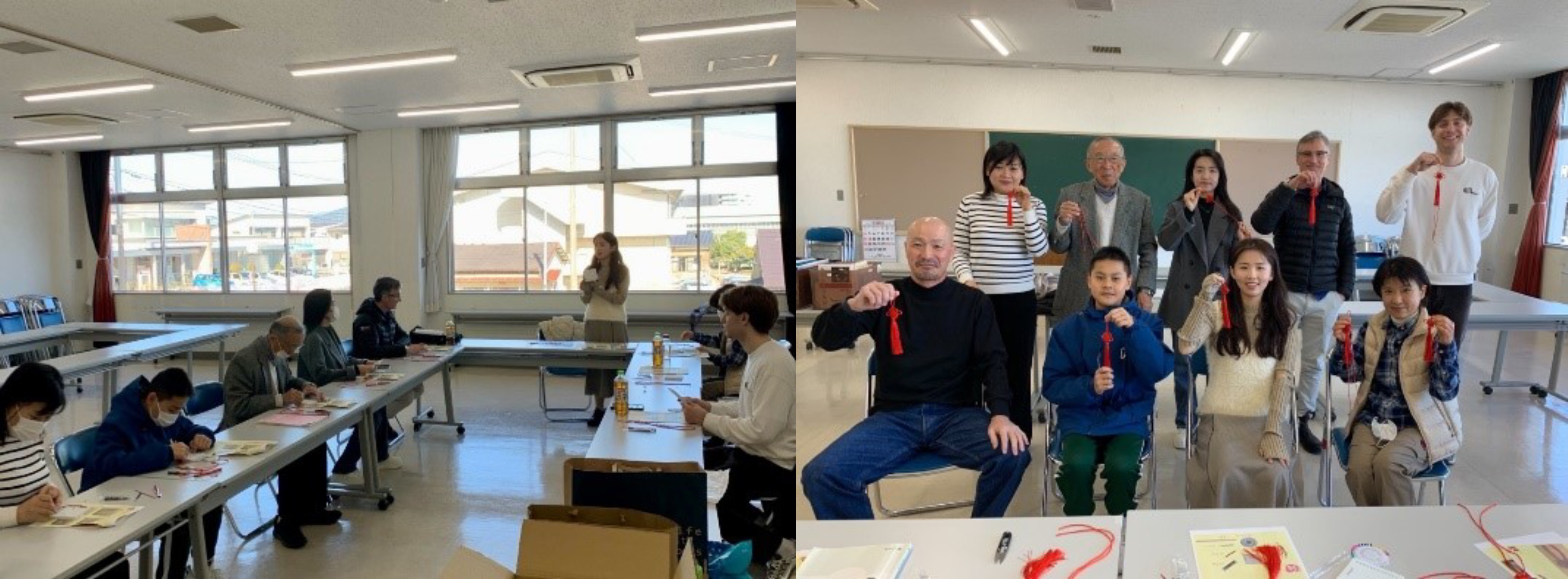 2月17日,团队在日本福冈、新泻两地,举办“纽结中华,文化编织之旅”专场活动,邀请海外学子及当地居民共同编织中国结,在农历新年伊始,送上一份美好祝福。中国结是传统手工编织工艺品,不仅是精巧的装饰,更寓意着吉祥、幸福、长寿、团圆、平安等诚挚的祝福。在场的国际友人了解到具体寓意后,不禁感叹其文化底蕴之深厚,对编织中国结充满了期待。本次活动分别采用了二回盘长结、三回盘长结编法,由团队成员逐步进行教学,同时配合以提前制作好的示意图,虽然有时会遇到步骤较为复杂之处,特别是最后的抽绳环节,需要来回抽动红绳,调整中国结的形状,但是通过细致的讲解与示范,最终成功完成了一个又一个精美的中国结。