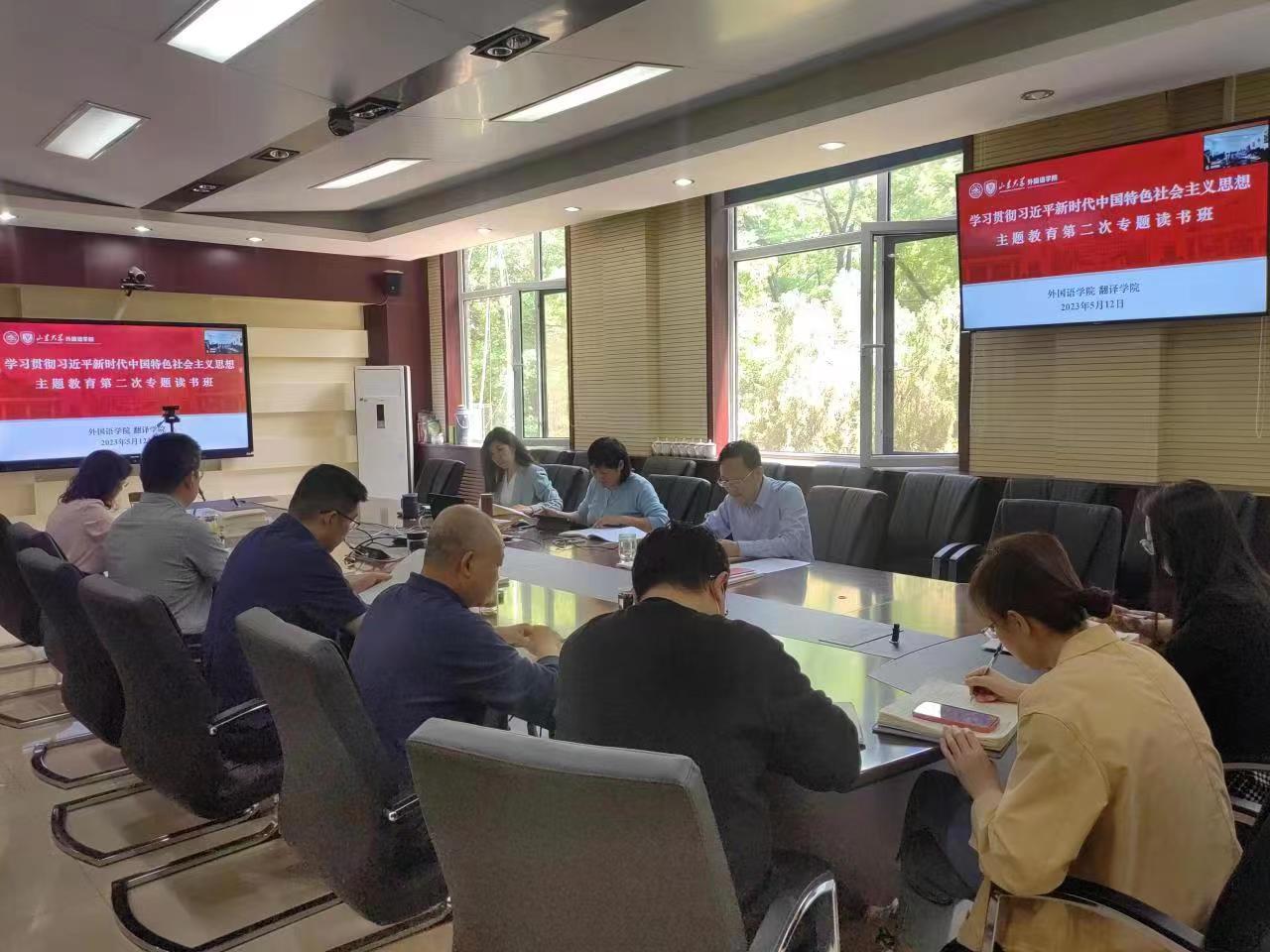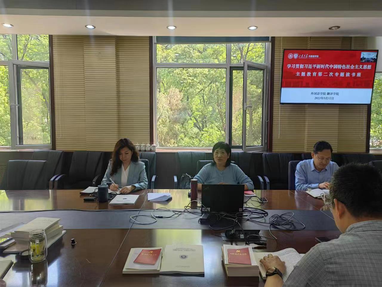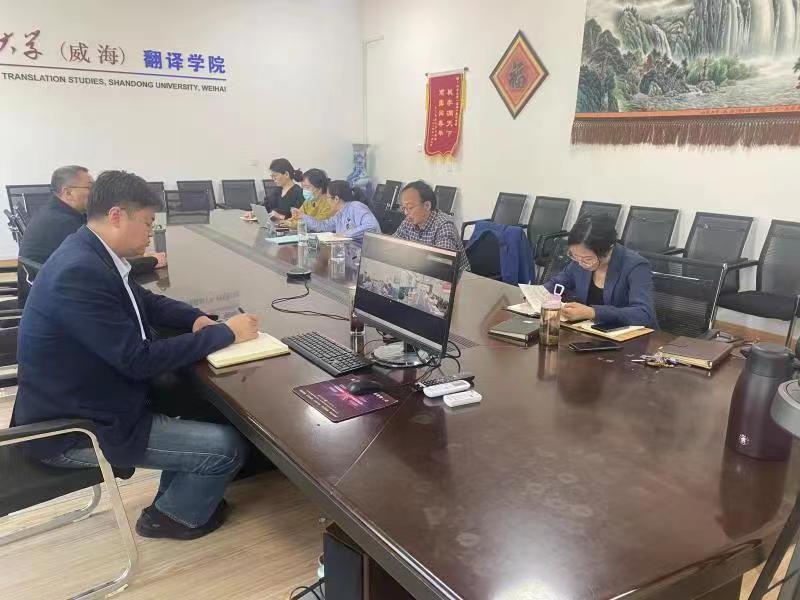 5月12日,awc777万象城娱乐官网和翻译学院共同开展联学活动,推进主题教育深入开展。awc777万象城娱乐官网院长、翻译学院院长、awc777万象城娱乐官网党委副书记王俊菊主持会议,双方学院的班子成员、党支部书记代表参会,学校第五指导组组长孙玉玲出席会议。