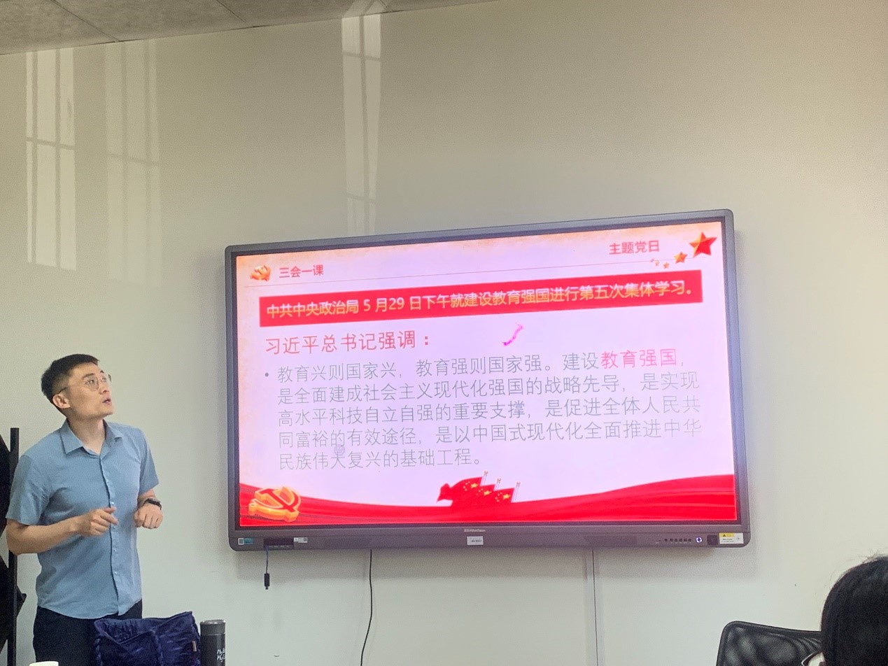 习近平总书记在讲话中指出,“我们要建设的教育强国,是中国特色社会主义教育强国,必须以坚持党对教育事业的全面领导为根本保证,以立德树人为根本任务,以为党育人、为国育才为根本目标,以服务中华民族伟大复兴为重要使命,以教育理念、体系、制度、内容、方法、治理现代化为基本路径,以支撑引领中国式现代化为核心功能,最终是办好人民满意的教育;培养什么人、怎样培养人、为谁培养人是教育的根本问题,也是建设教育强国的核心课题”。张延飞同志强调,支部全体党员同志要认真深刻领悟总书记的讲话精神,把讲话精神贯穿于今后的教学科研;我们要以讲话为契机,探寻新的教学科研增长点,把总书记的讲话真正落到实处,为国家培养社会主义现代化建设的栋梁之才,确保党的事业和社会主义现代化强国建设后继有人。